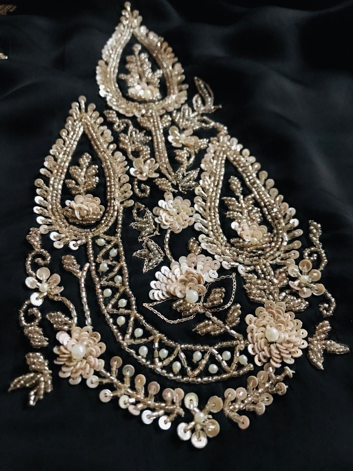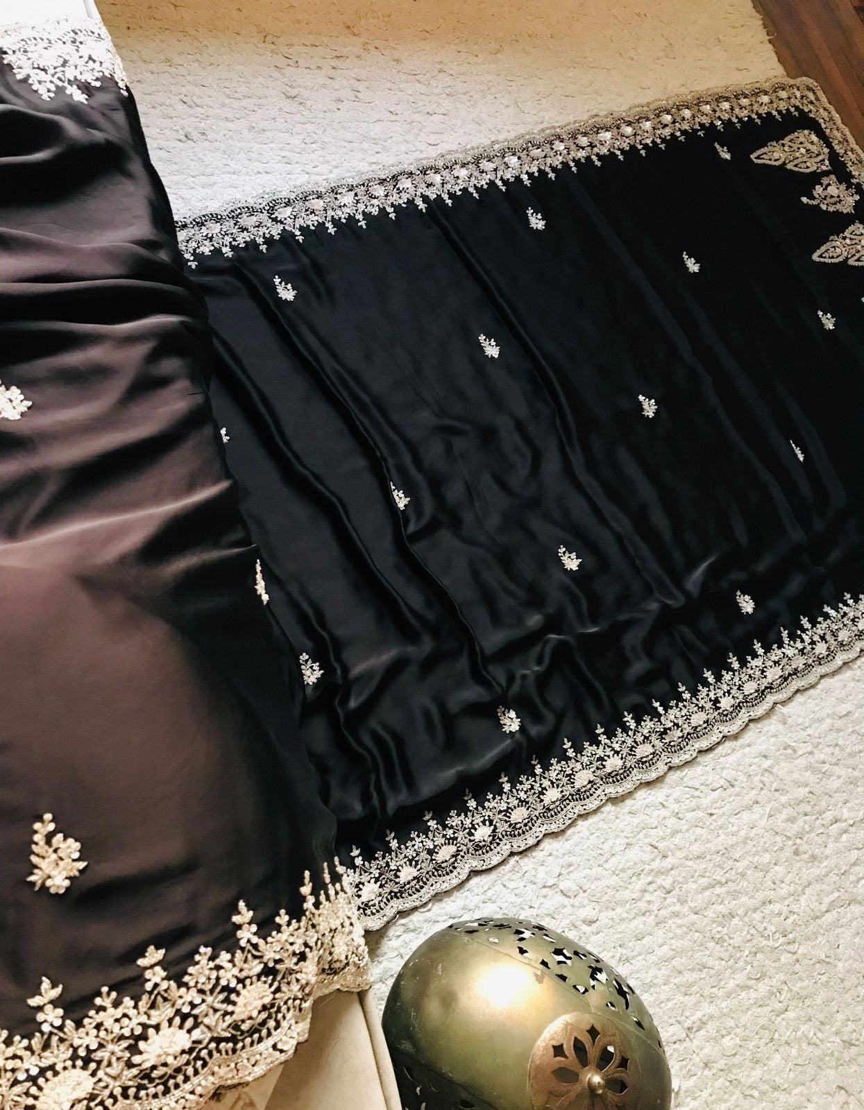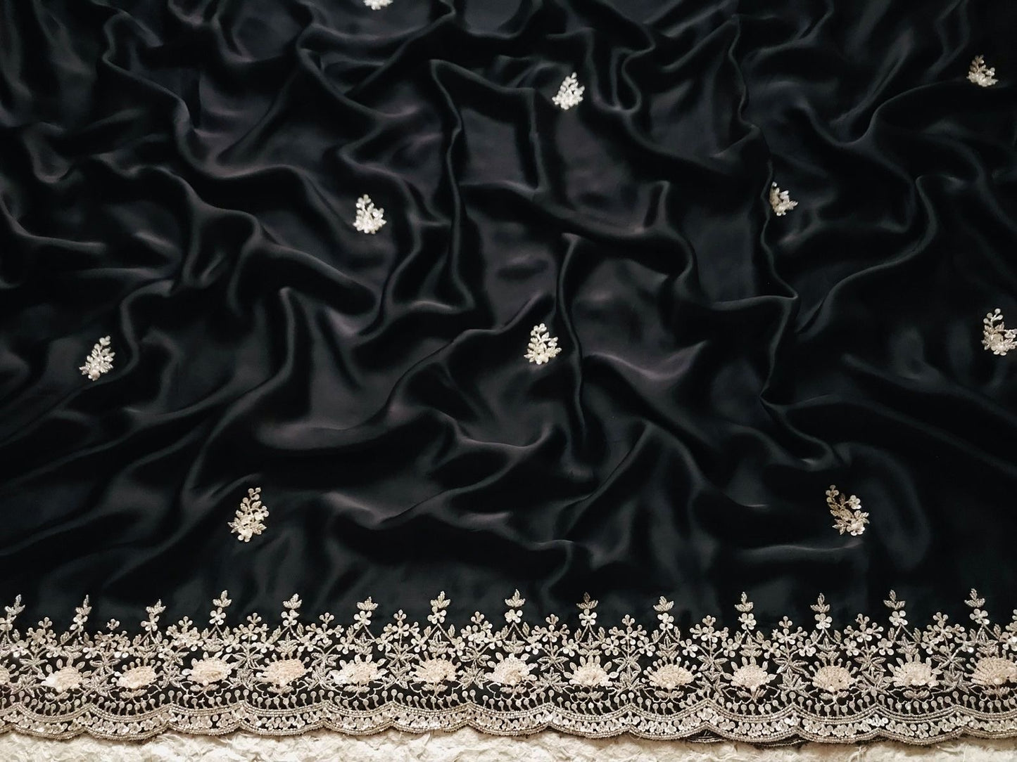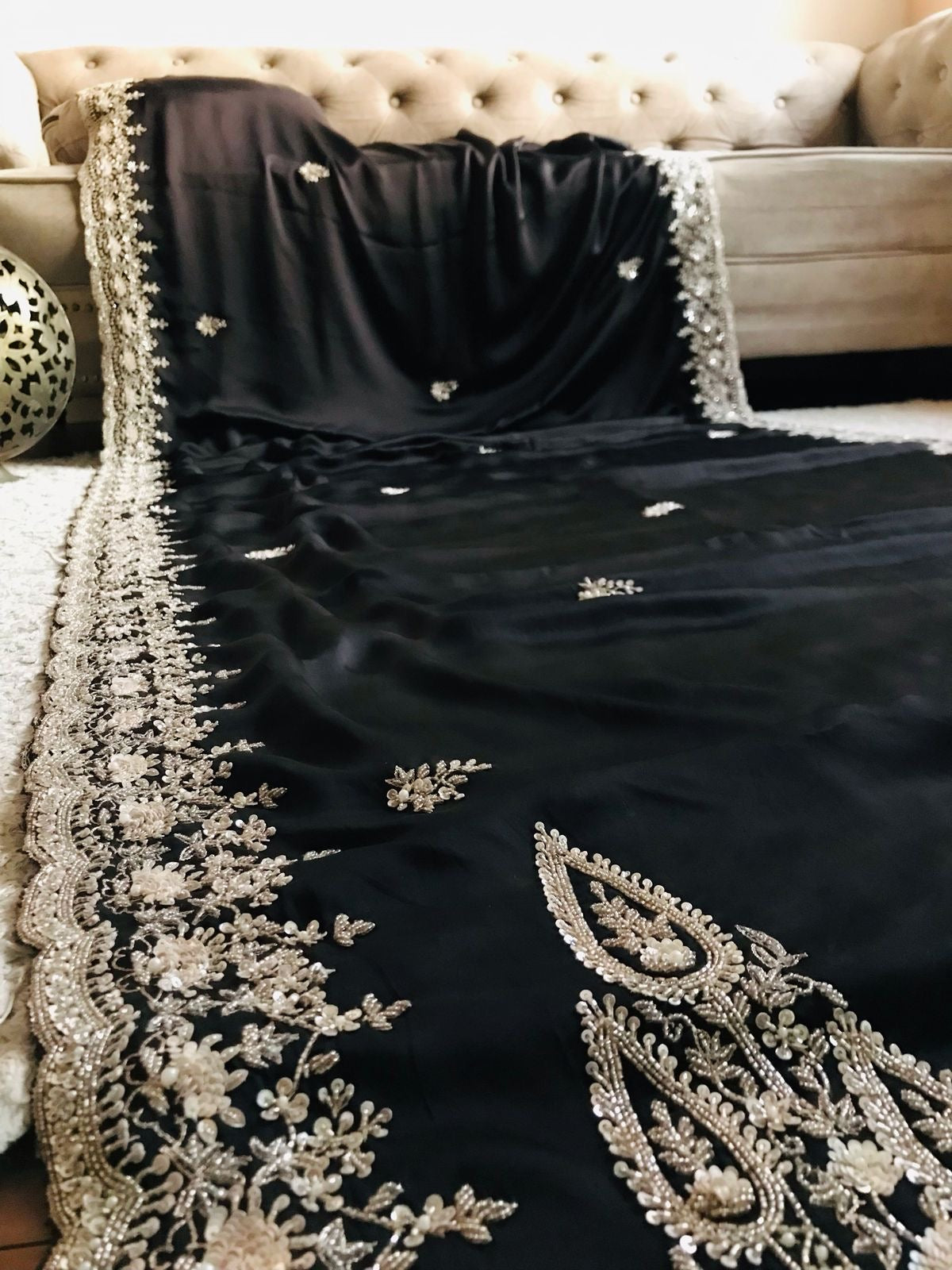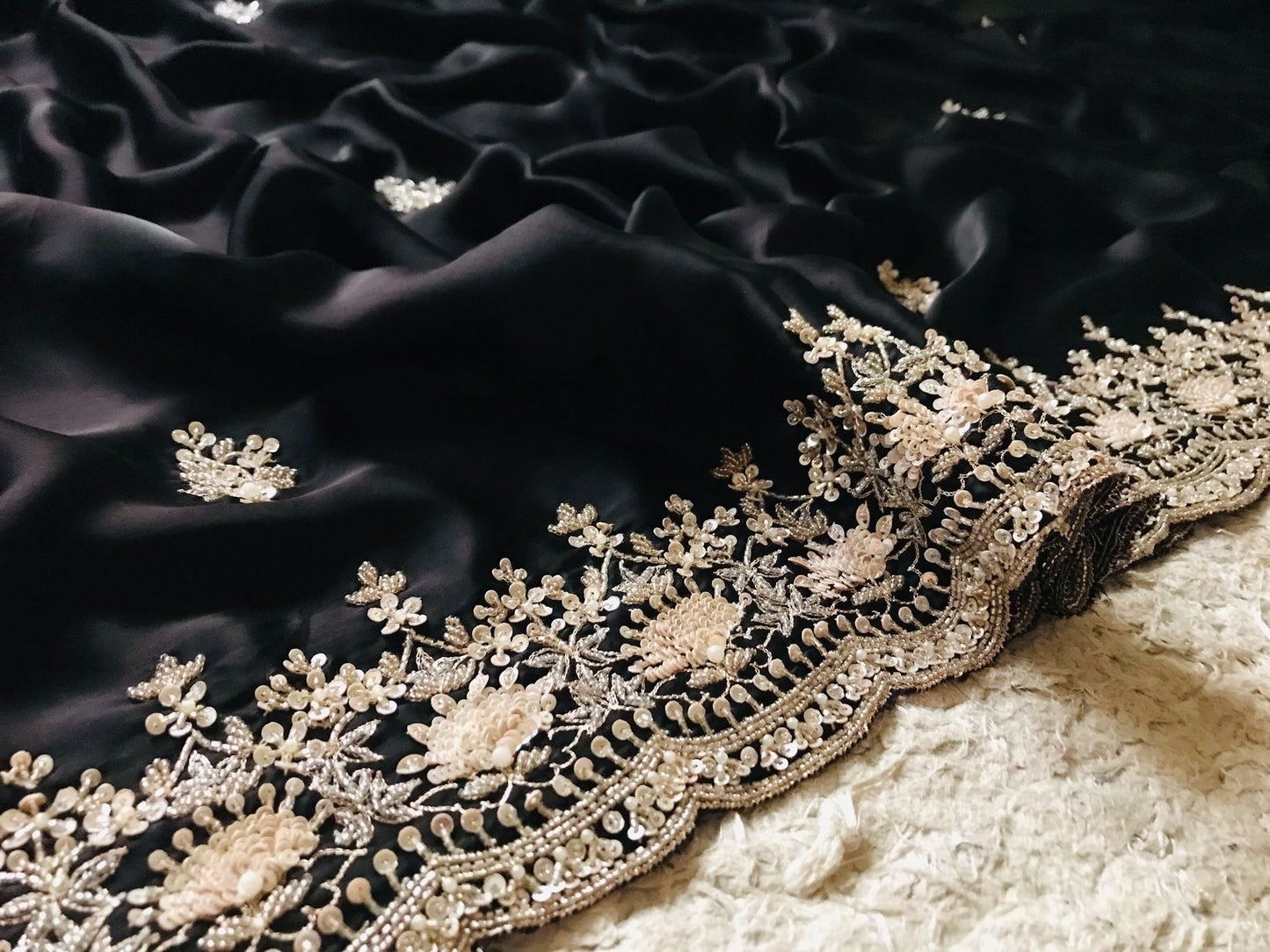 Magnificent Mystic Black Luxurious Premium Pure Pure Satin Crème Organza Silk drapes of luxury embellished with exquisitely handcrafted rich zardozi handwork & running gorgeous zardozi handwork bp