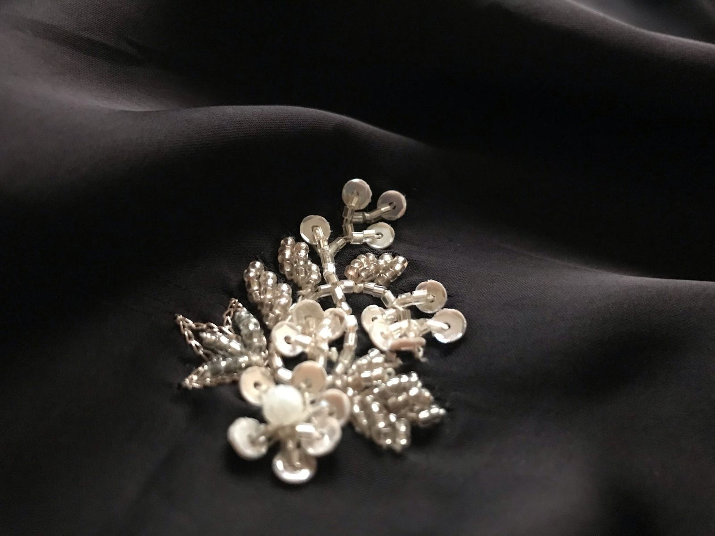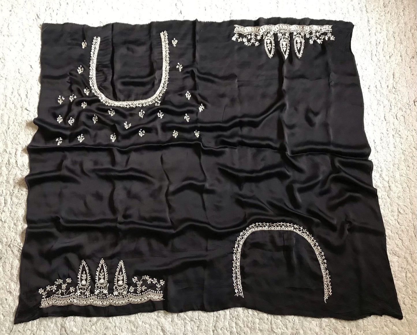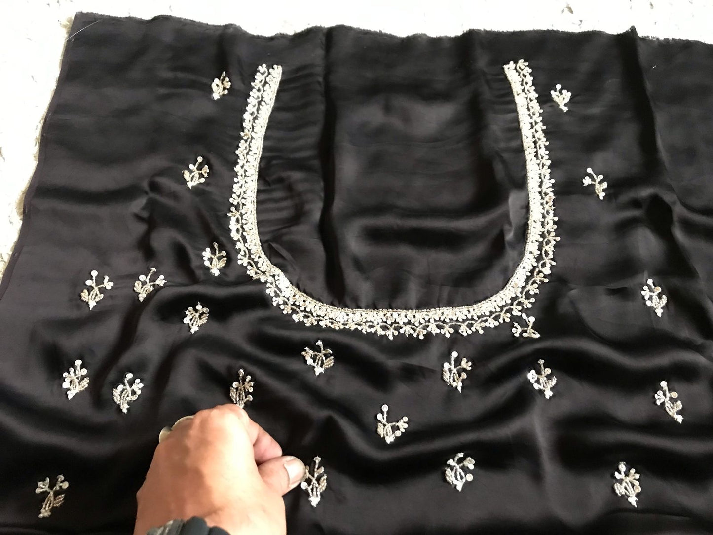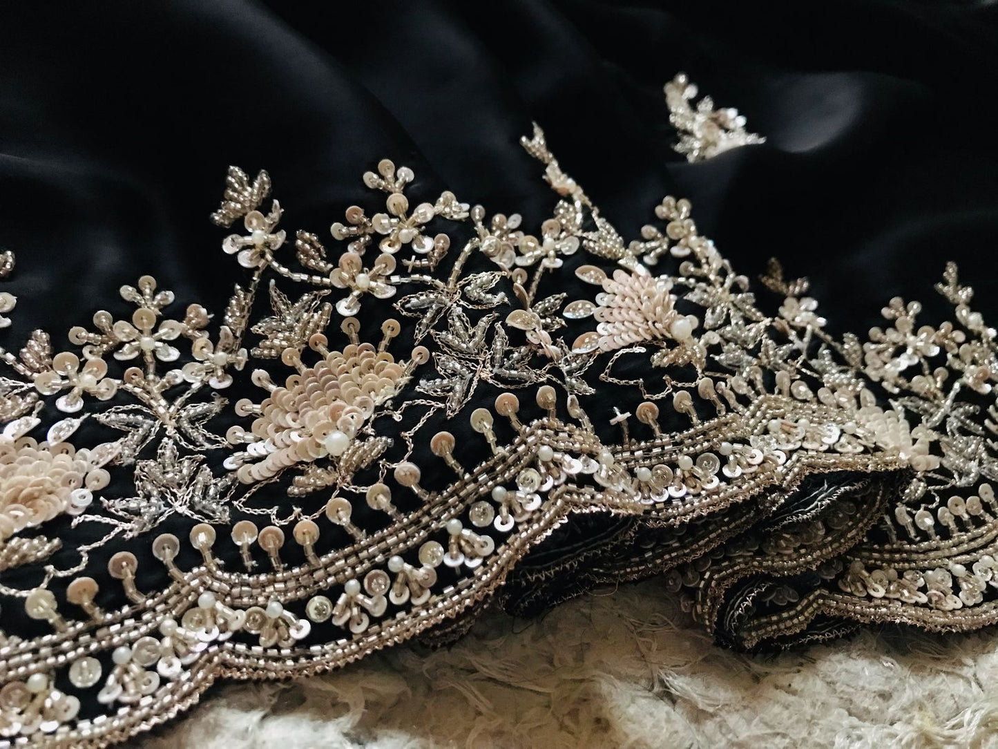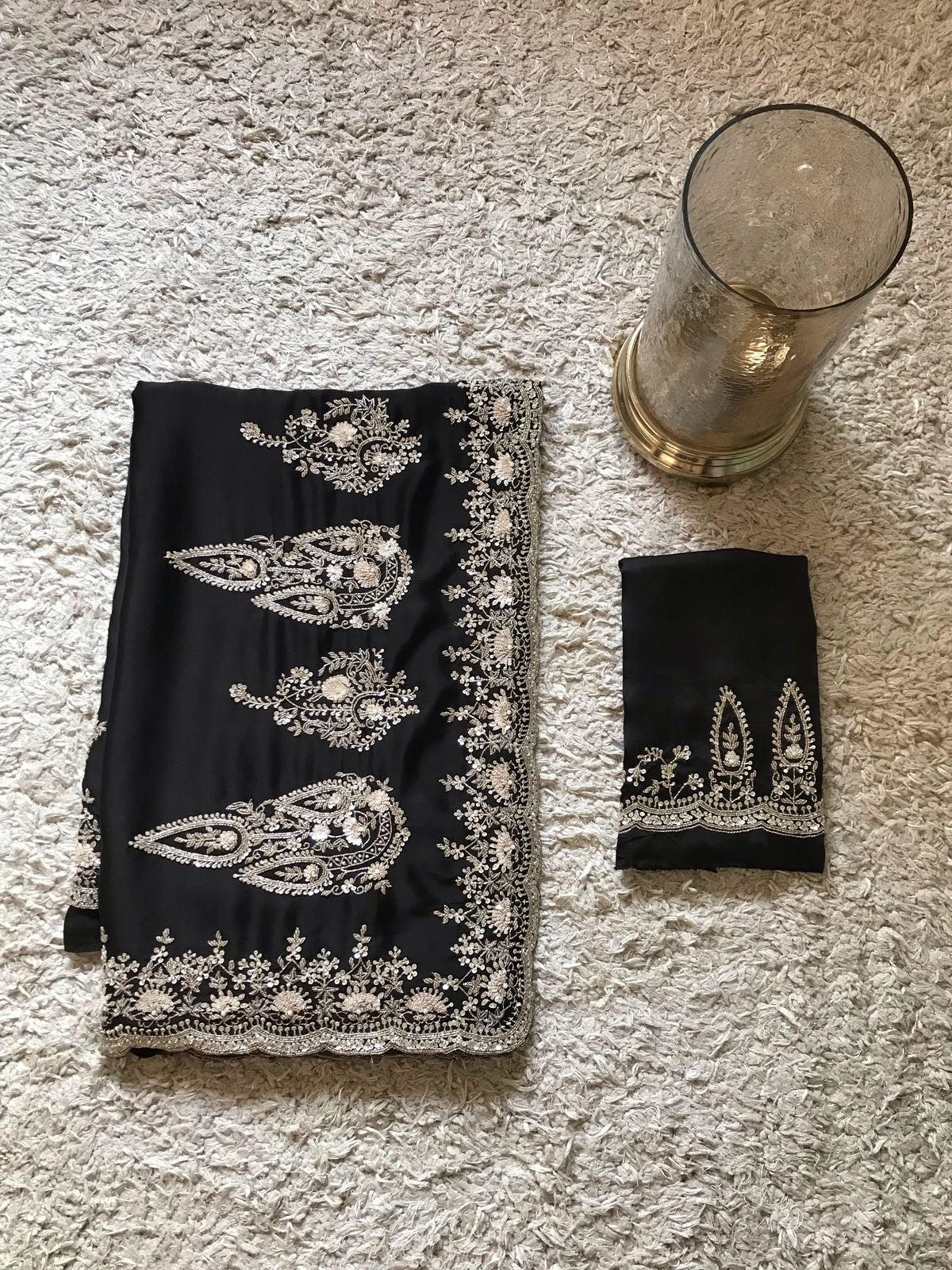 Magnificent Mystic Black Luxurious Premium Pure Pure Satin Crème Organza Silk drapes of luxury embellished with exquisitely handcrafted rich zardozi handwork & running gorgeous zardozi handwork bp