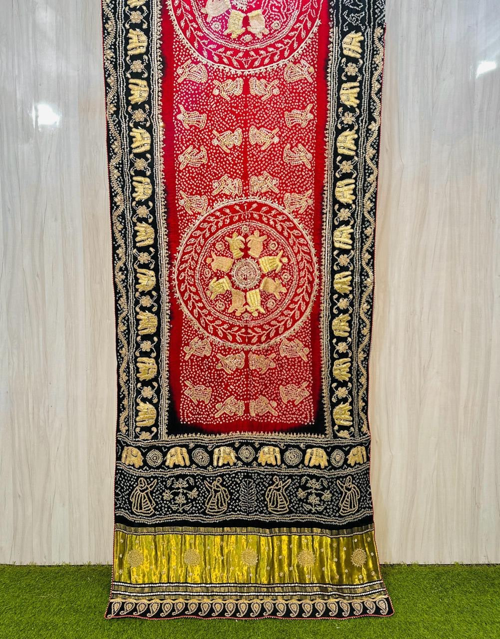 This pure gajji silk bandhani saree features intricate heavy embroidery, showcasing exceptional craftsmanship through original handwork. The silk's natural sheen combined with the detailed embroidery enhances the garment's elegance, making it suitable for formal occasions. The lightweight fabric provides comfort while maintaining an exquisite drape.