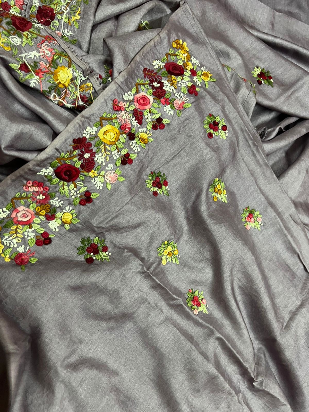 Crafted with luxurious Tussar fabric, this saree is a timeless piece that exudes elegance. Adorned with hand-embroidered French knots, it adds a touch of sophistication to any occasion. Complete with a matching blouse piece, it offers versatile styling options for a unique look every time.