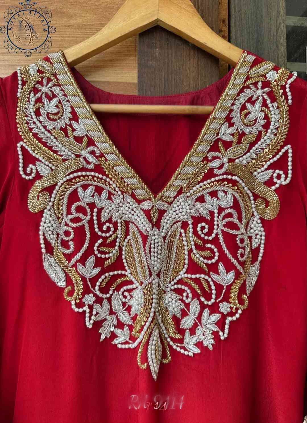 pure crepe designer stiched shirt with beautiful pearl cutdana dabka and zari hand embroidery on neckline plus lace detailings on sleeves and ghera...
