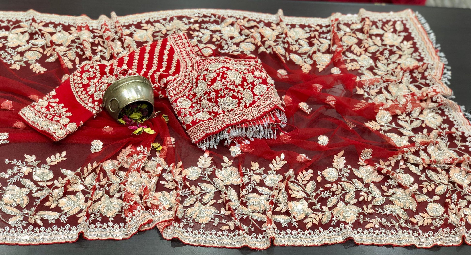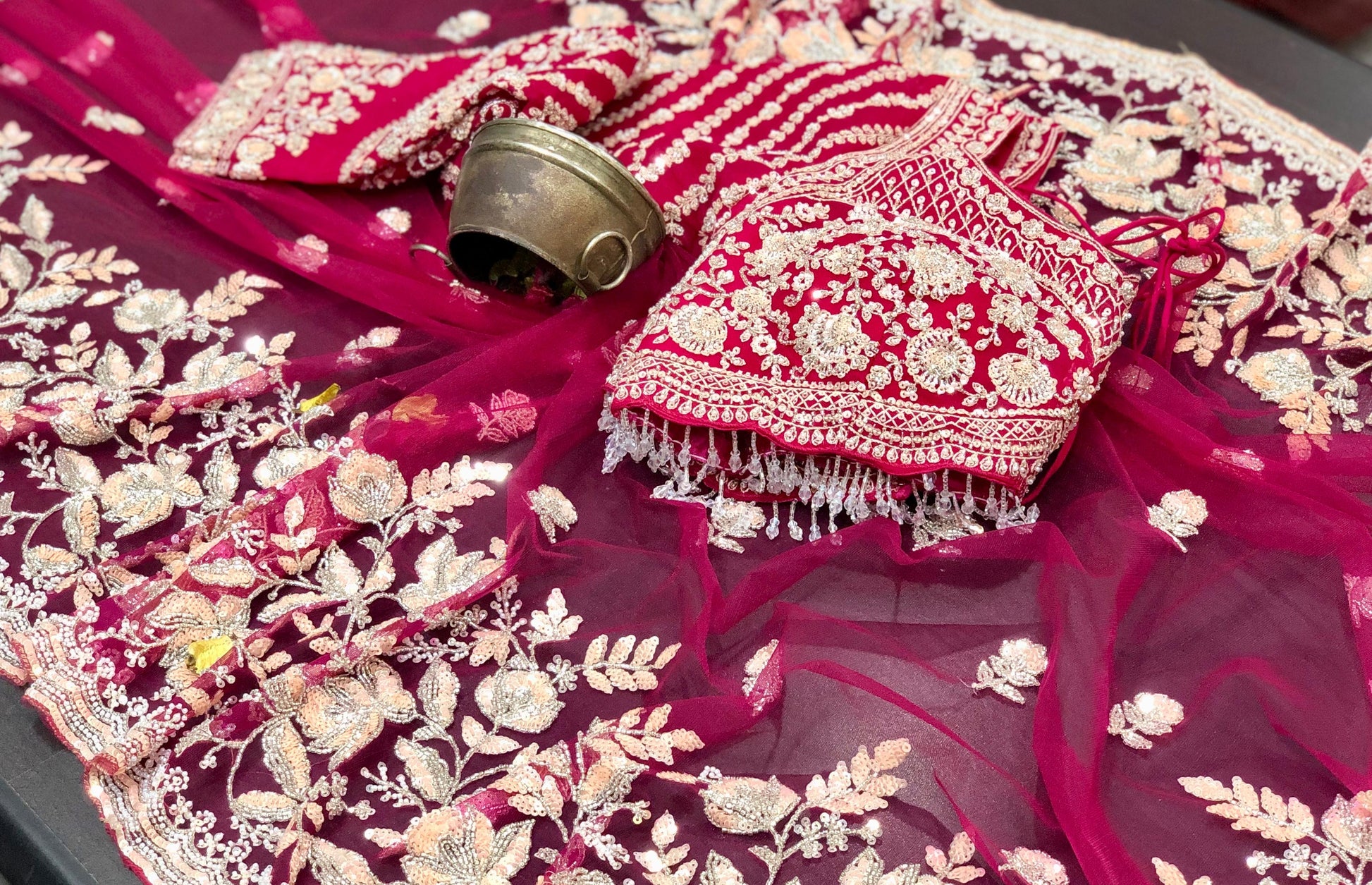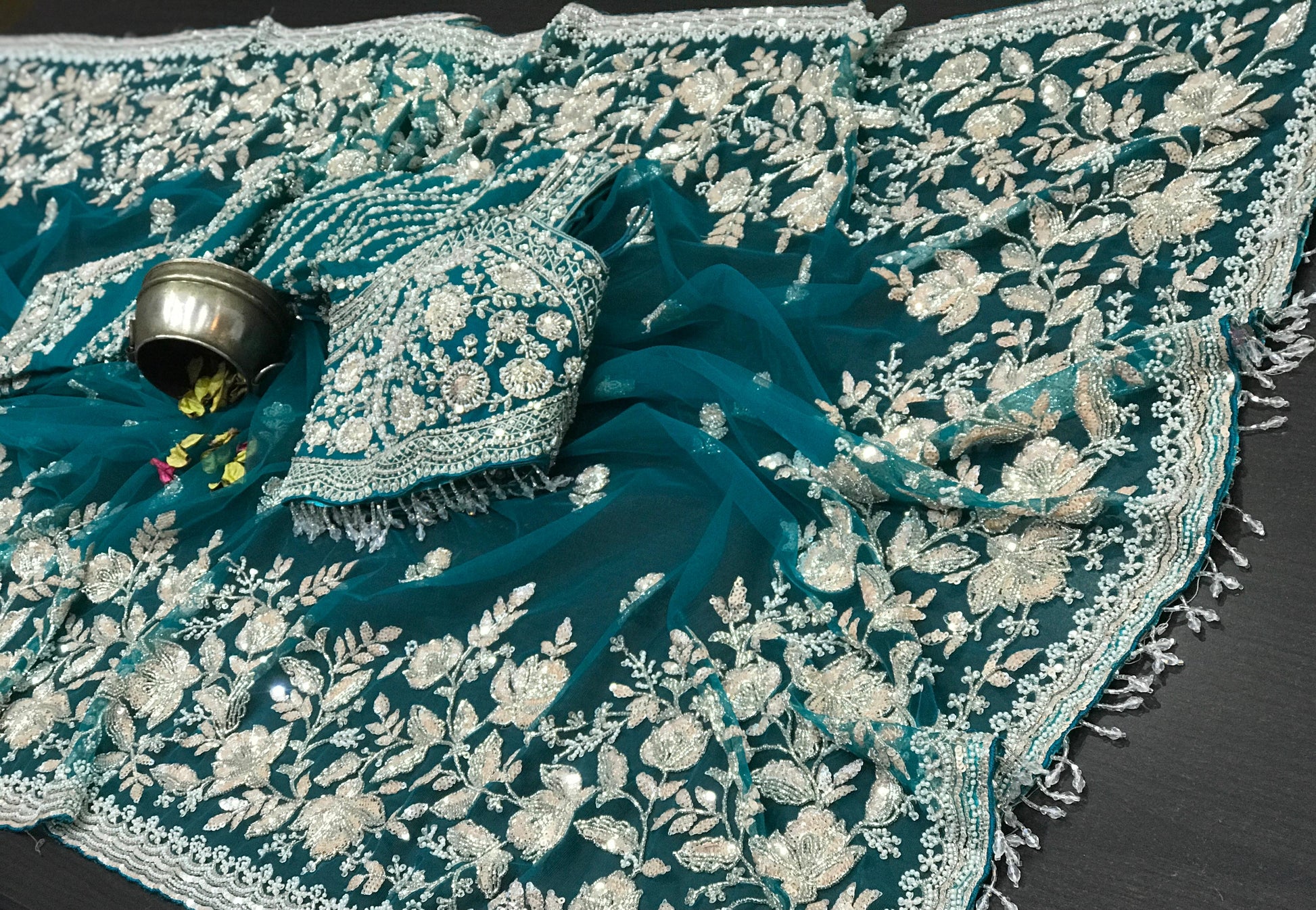 Sabyasachi Inspired Pure Net Designer Saree with Intricate Handwork Of Cutdana Sequence & Zardozi with Full Sleeves Stitched Blouse